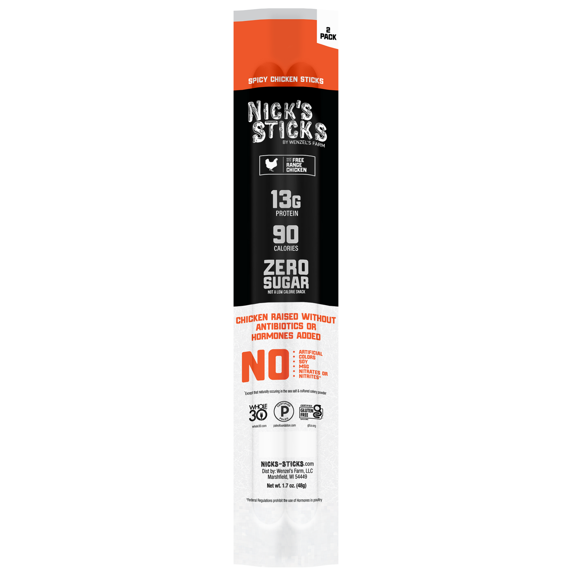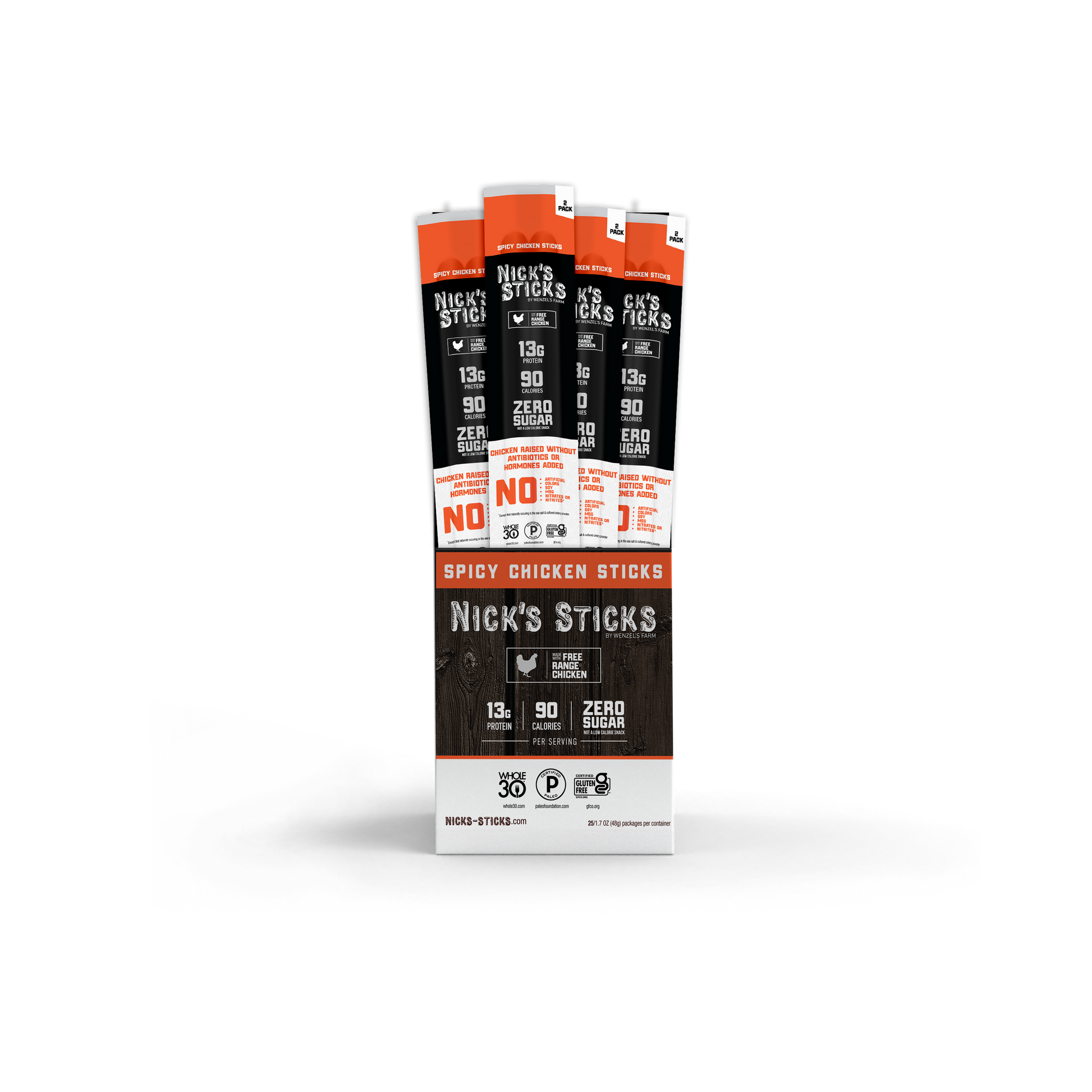 Our newest protein snack brings the taste of real chicken to Nick’s premium lineup of snack sticks. Like all of our quality products, our free-range chickens are raised on sunshine and fresh air with plenty of room to roam. Combine this with our blend of herbs and spices, and you have one of the best-tasting, hormone-free, sugar-free (not a low calorie food), and antibiotic free chicken sticks available on the market today. Available in original or spicy, Nick’s chicken sticks are sure to become a new favorite.