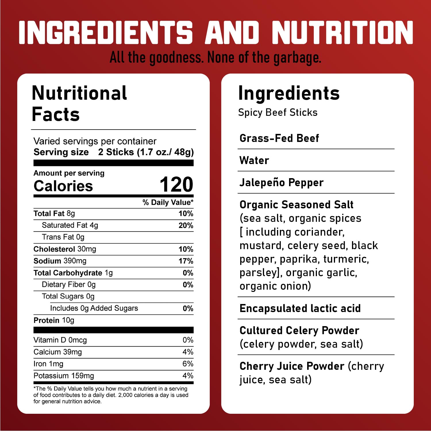 Nick's Sticks are MADE IN THE USA WITH 100% GRASS-FED BEEF, which has nearly 5x the amount of Omega-3's as conventionally raised beef! Plus more Vitamin A, Vitamin E, Potassium, Iron, & Zinc.