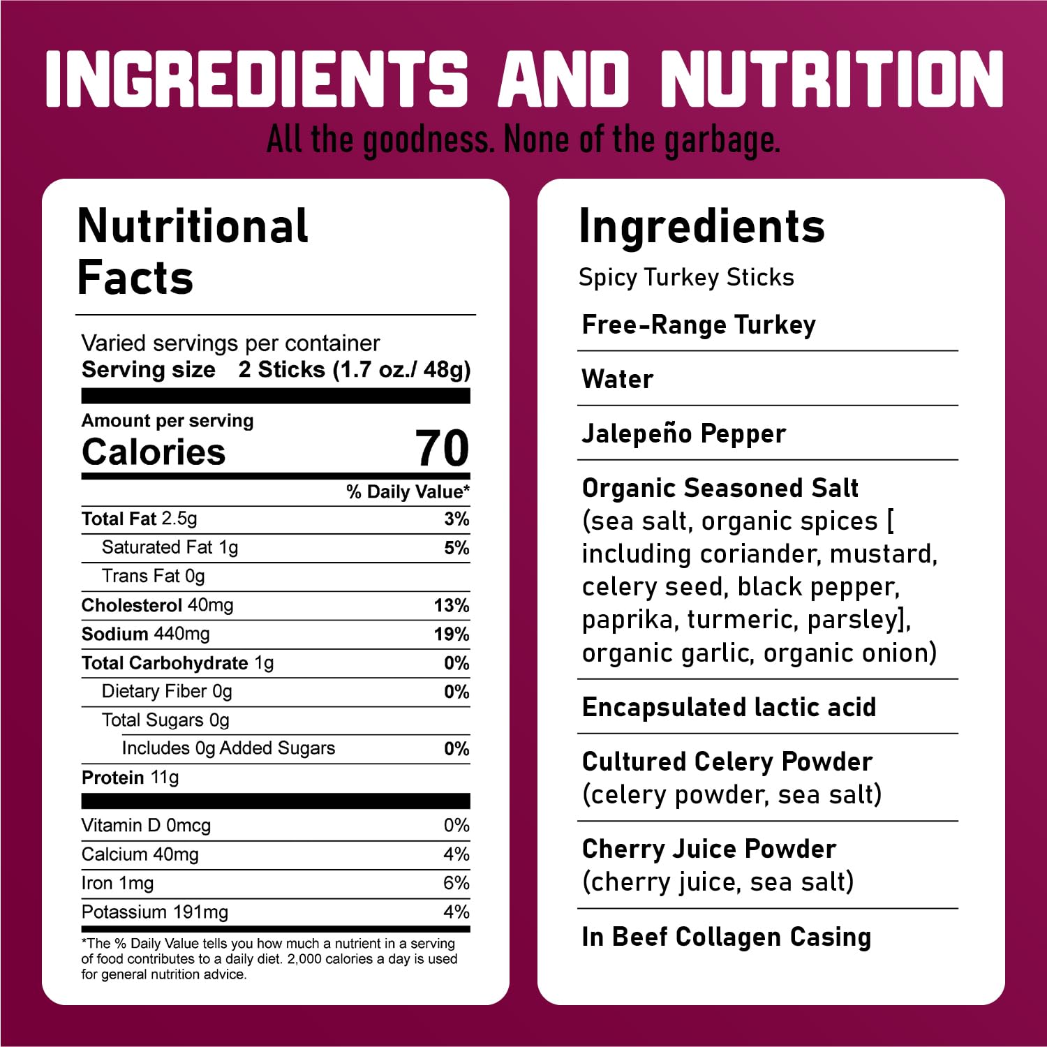 Can’t decide on your favorite Nick's Sticks Snack Stick flavor? This 12-stick variety pack has you covered with 3 Beef, 3 Turkey, 3 Spicy Beef, and 3 Spicy Turkey sticks. Crafted from 100% grass-fed beef and free-range turkey, Nick’s Sticks are clean, protein-packed, and full of flavor. Perfect for sampling the full lineup, keeping your snack game fresh, or sharing with friends.